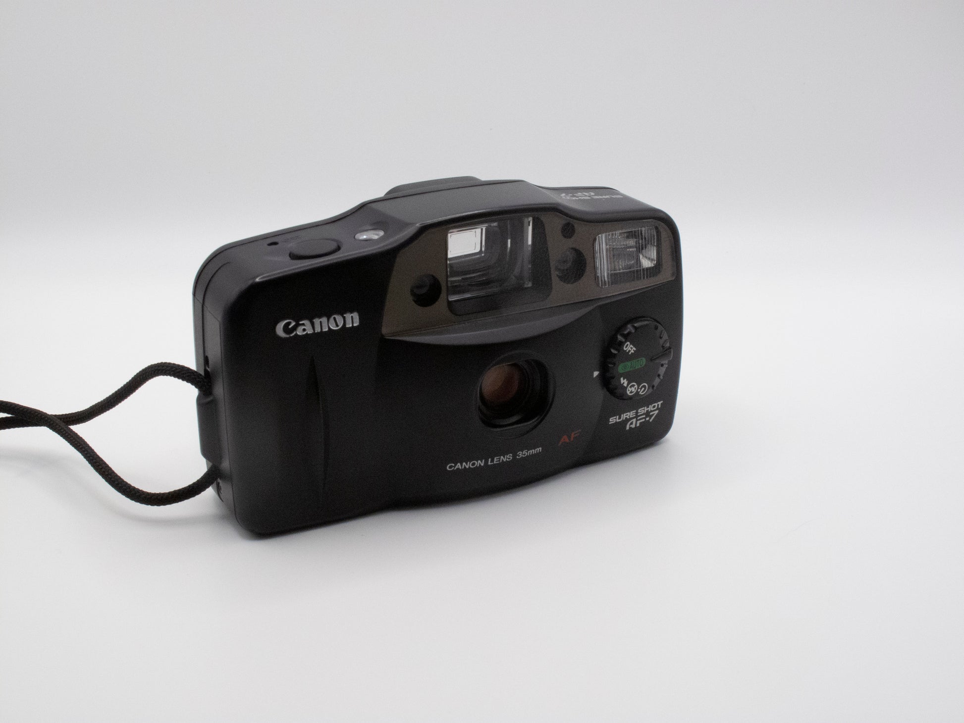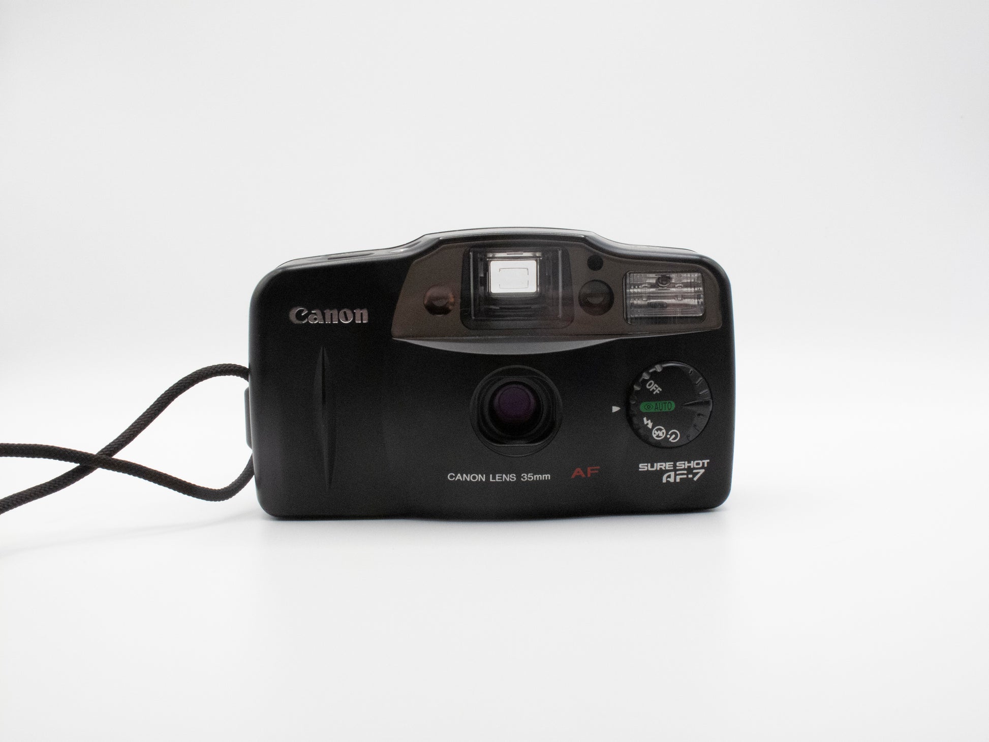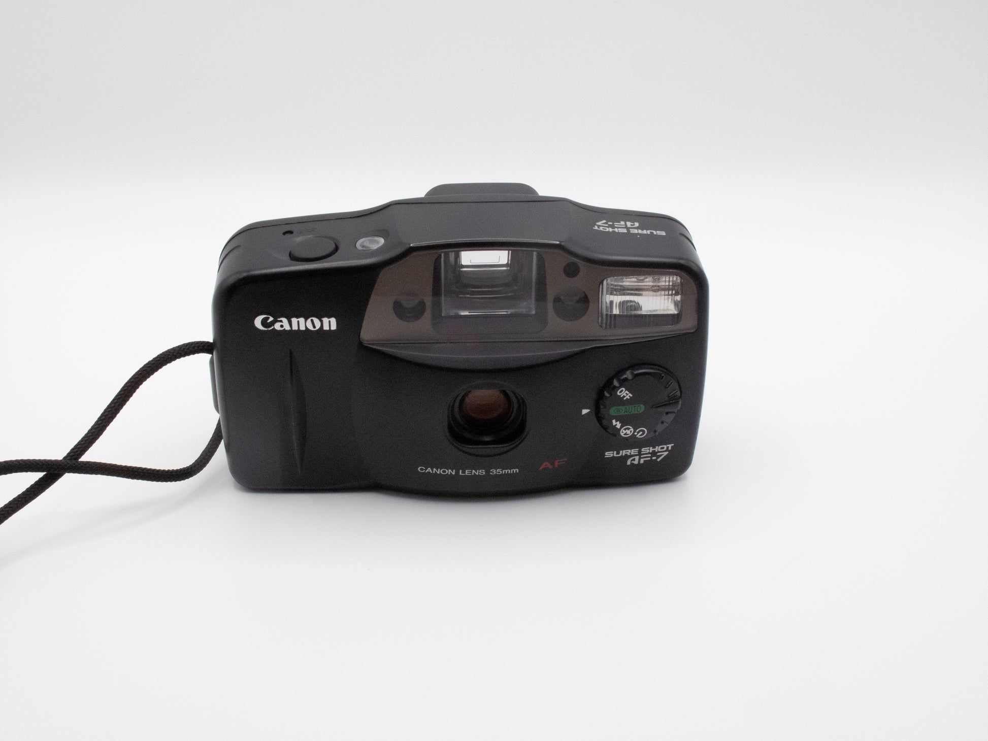 The Canon Sure Shot AF-7 is a compact 35mm film camera that combines simplicity with high-quality performance, perfect for both novice and experienced photographers. Featuring a 35mm f/4.5 lens with a built-in flash, this camera offers effortless automatic focus and exposure, ensuring your shots are consistently sharp and well-lit. It boasts a durable construction, easy-to-use controls, and a sleek design that fits comfortably in your hands or pocket. Specifications include a minimum focus distance of 0.6m, a shutter speed range of 1/45 to 1/180 sec, and the ability to operate with ISO 100-400 film.